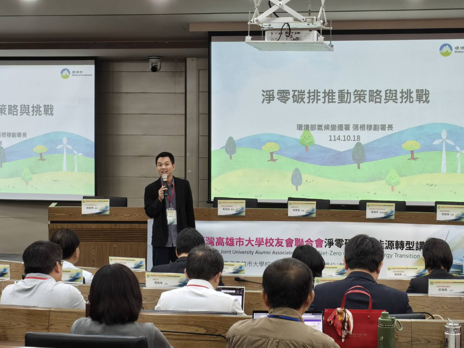 【本報記者陳明成高雄報導】臺灣高雄市大學校友會聯合會(雄大會)18日攜手輔英科大舉辦「淨零碳排學術講座」,邀集產官學專家學者探討淨零碳排與能源轉型。座談達成三項共識建言,盼中央完善碳費與綠色金融制度,地方強化公民參與,深化產學合作以推動綠領人才培育。