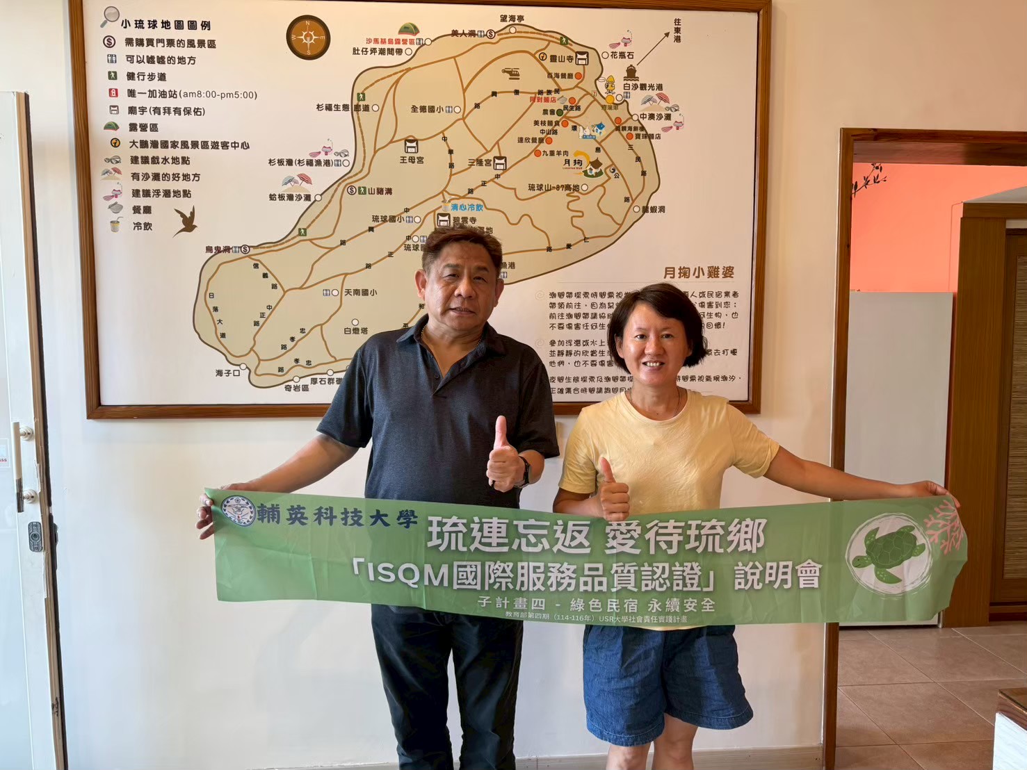 「綠色民宿‧永續安全」是重中之重,由休閒與遊憩事業管理系于建中主任主導,協助小琉球民宿導入「ISQM國際服務品質認證」,提升旅宿品質與永續形象。團隊辦理AED急救訓練並設置多台設備,打造「綠色民宿安全網」,同時透過「管家服務」課程與「CSIM服務稽核管理師」證照輔導,培育具國際服務視野的人才。