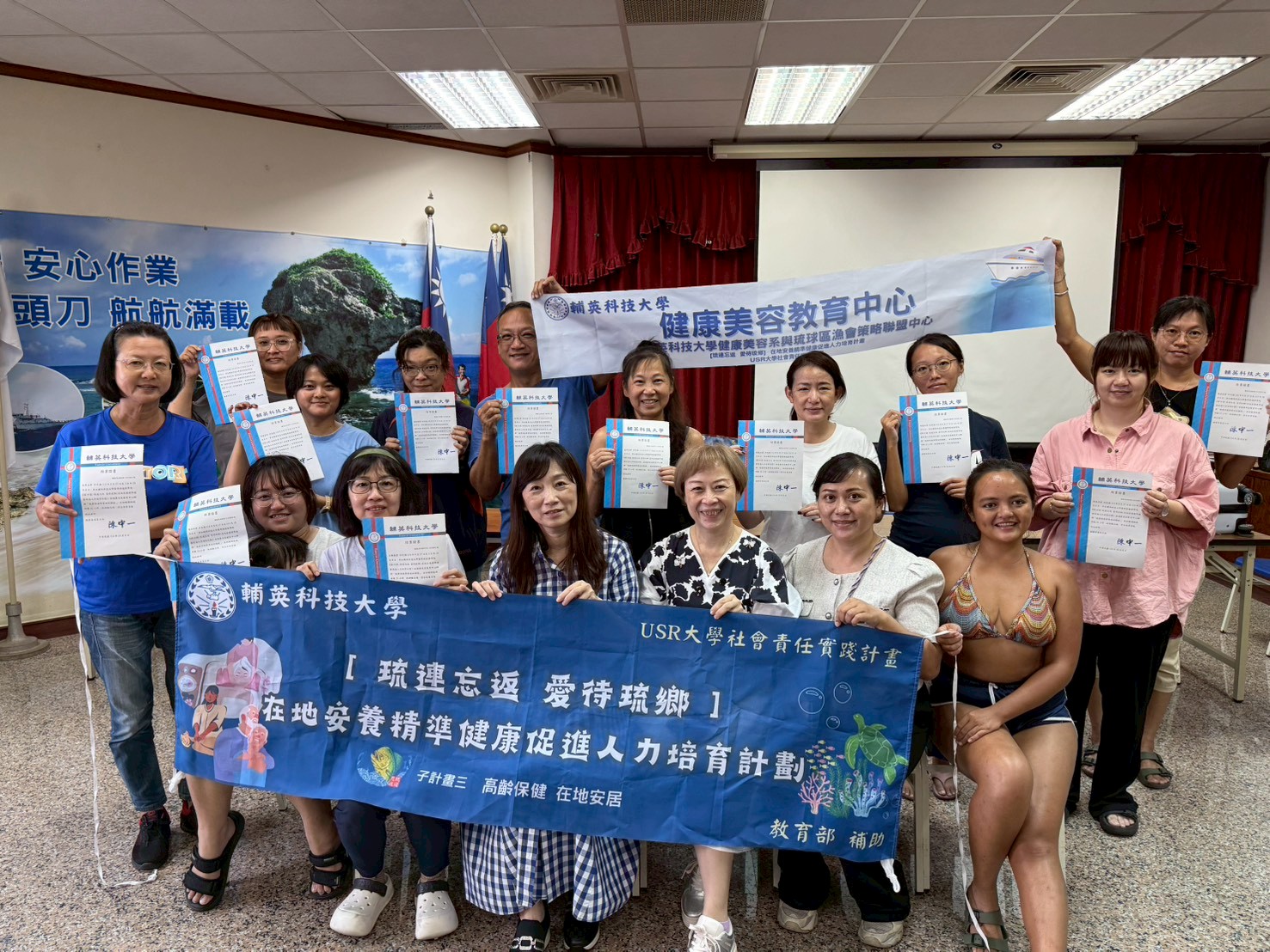 「高齡保健‧在地安居」由健康美容系柯美華副主任與黃曉玲助理教授於琉球漁會設立健康美容教育中心,開設芳療與保健課程,輔導居民取得專業證照並發展第二專長。