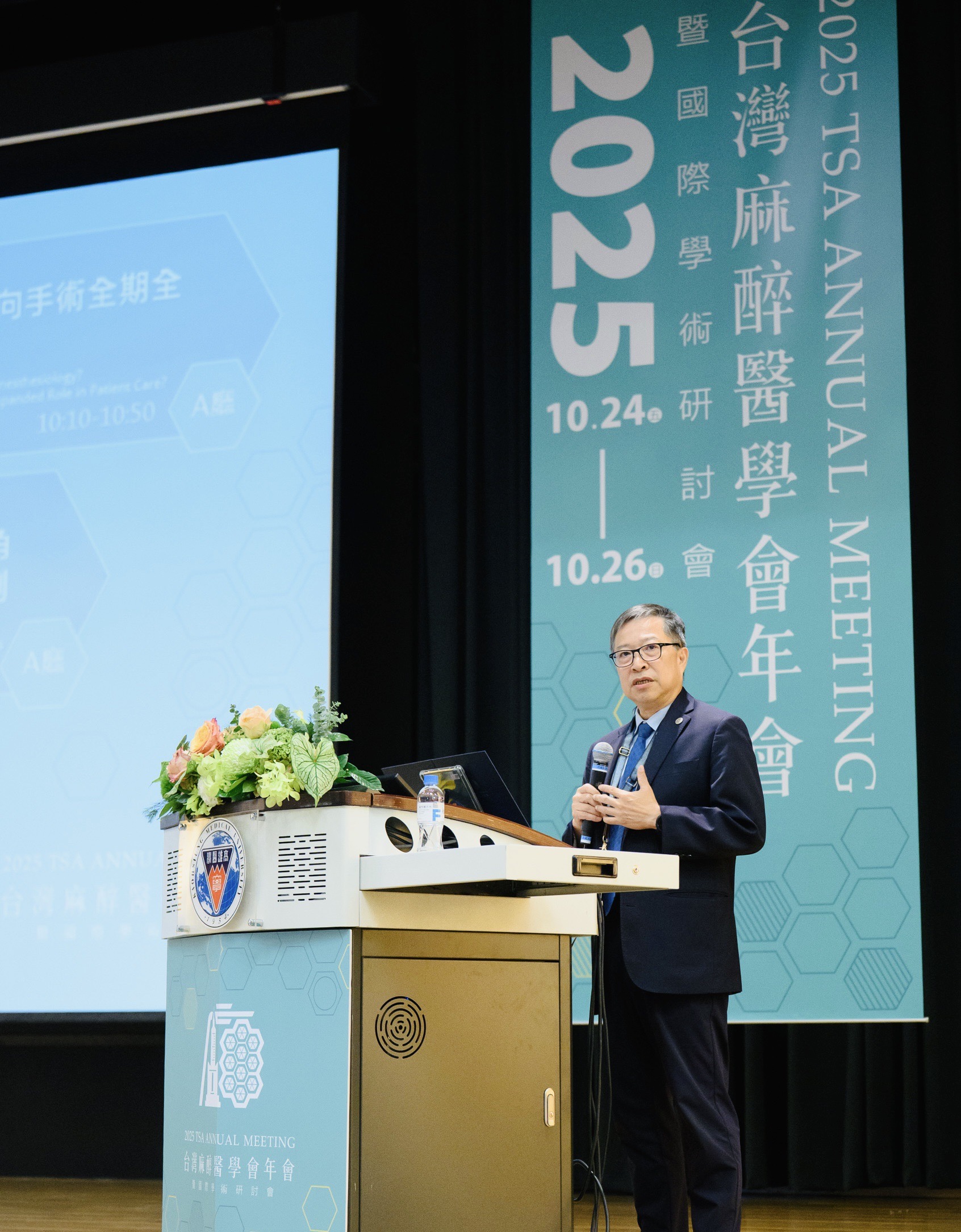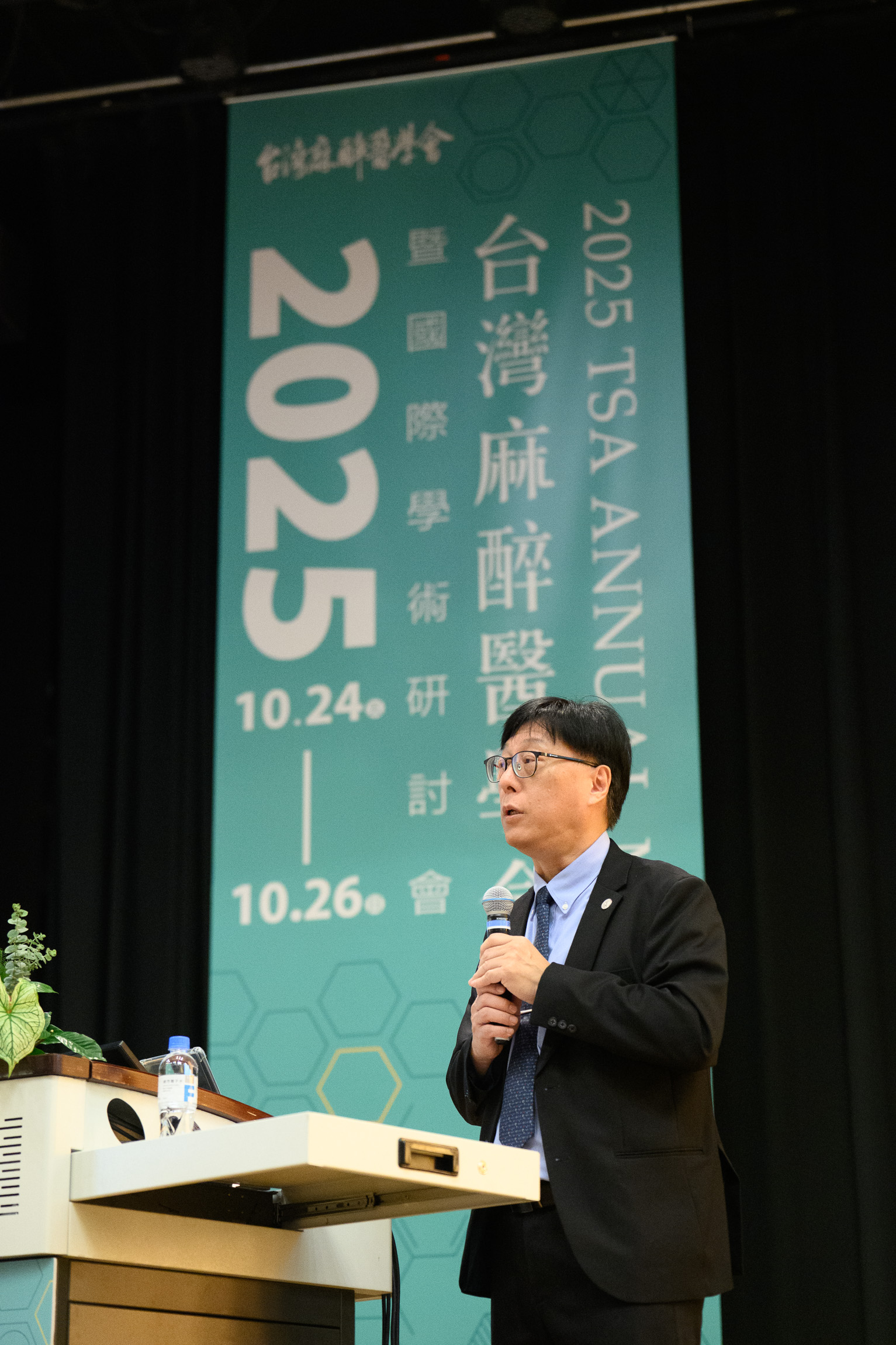 高雄醫學大學余明隆校長歡迎大家的到來,特別強調麻醉醫學不只是技術的發展,更是醫療永續、社會責任與人文關懷的具體展現,也提到醫學教育不只是傳授技術,更是一場關於責任與價值的教育,從AI、大數據、綠色醫療、到跨領域創新,這些都是未來醫學的關鍵,而麻醉正站在這場變革的最前線。