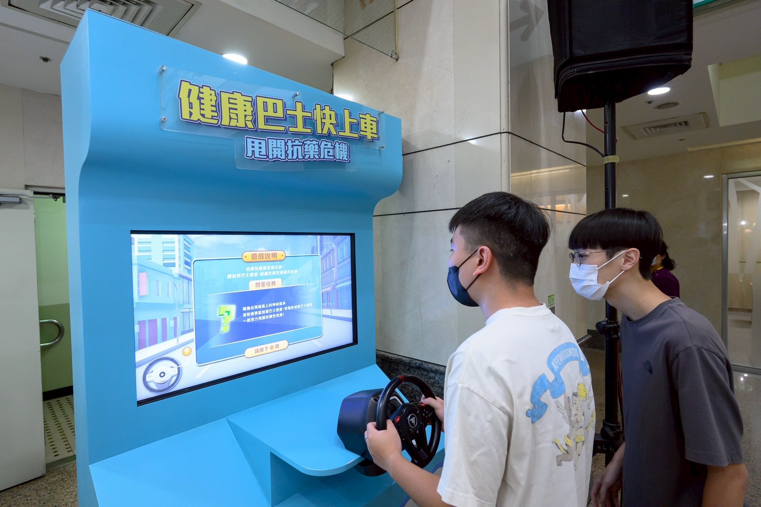 高醫「健康巴士快上車,甩開抗藥性危機」展覽,除了衛教展板外,更設有互動裝置,讓民眾化身「健康巴士駕駛員」。在駕駛過程中,每答對一題衛教問答,巴士就能加速並拉開與抗藥性細菌的距離,象徵透過正確知識與預防行動,才能真正「甩開抗藥性危機」,期盼各界攜手守護臨床抗生素的正確使用性,確保醫療量能足夠,為台灣打造完善且永續的醫療照護環境。