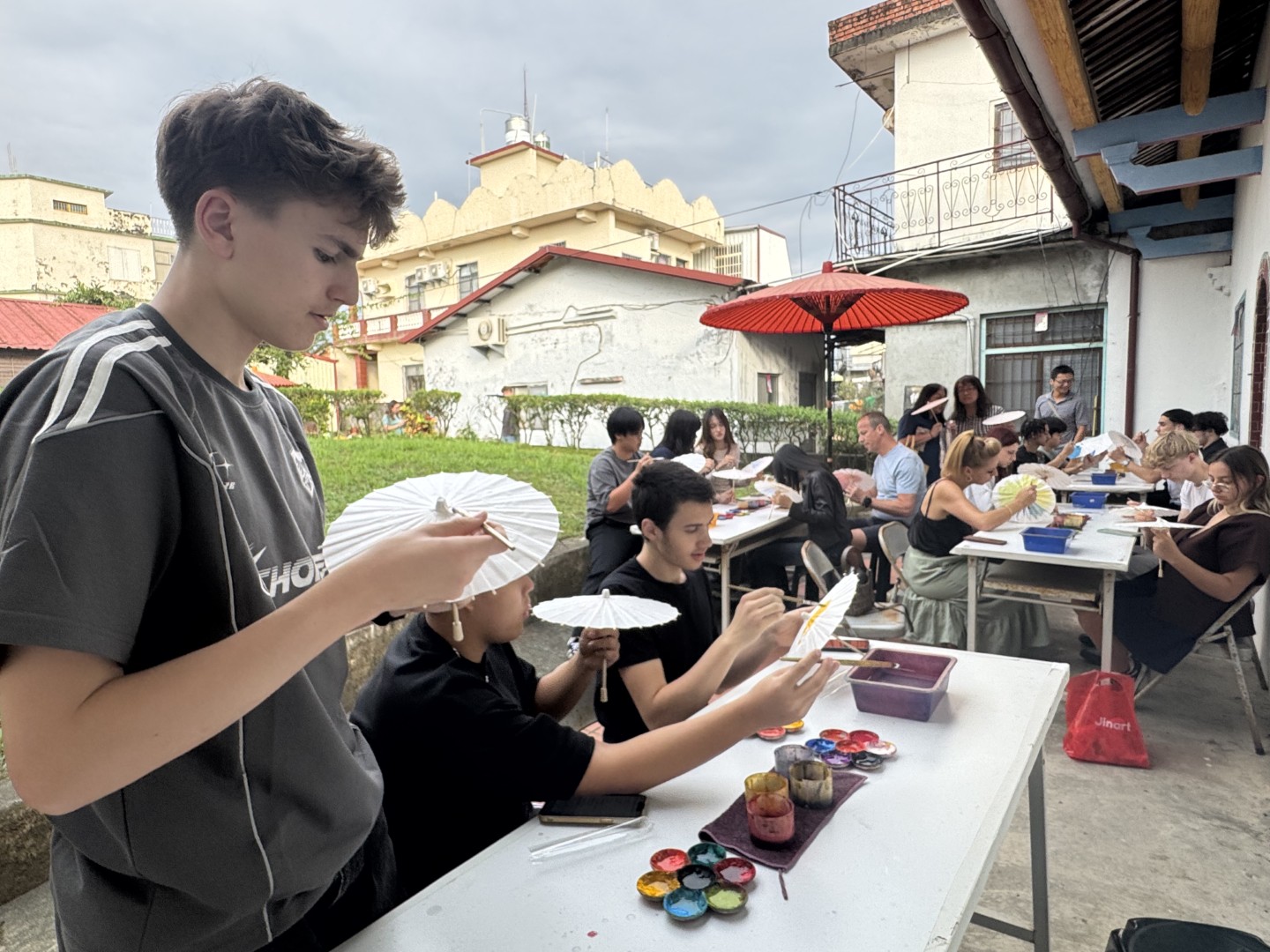 比利時學生代表 Mattea 分享交流感言時表示,首次到亞洲參訪心情感到特別興奮,臺灣的料理技巧與風味與家鄉截然不同,他最喜歡蔥油餅,因為口感像披薩但更具層次。兩週期間參與美濃藍染、彩繪油紙傘及多項地方文化體驗,讓他看見臺灣生活的細緻與美好。