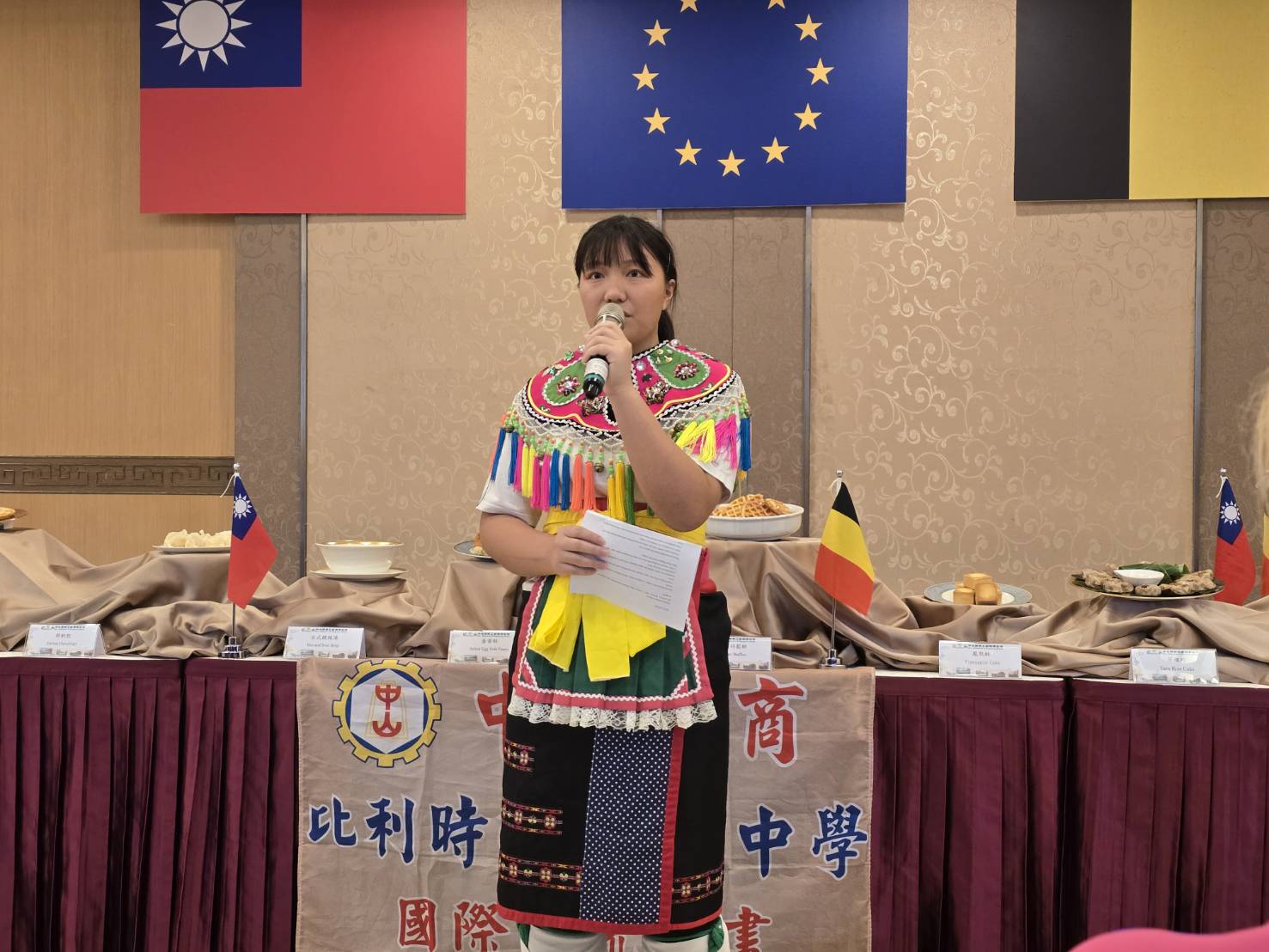 中山工商餐三甲學伴曾伊汎(阿美族)特別盛裝穿著族服,以流利英文分享心得,她指出,因熱愛烘焙平時即靠 App 與影片自學英文,這次能運用語言能力與專業技能協助比利時學生學習製作台灣糕點,對她而言是莫大的成長,這次經驗讓她更確信自己的國際夢,她將於明年三月赴比利時交流,期待學習更多歐式麵包技術。