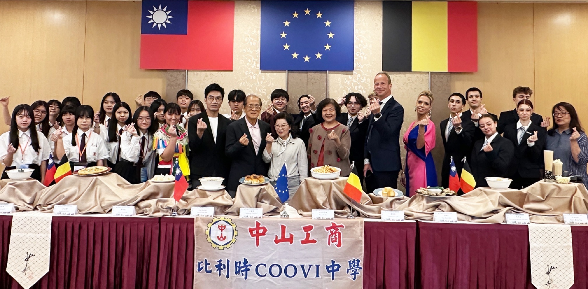 中山工商14日與比利時布魯塞爾COOVI中學簽訂合作備忘錄MOU,雙方締結教育夥伴關係,十位師生來臺進行教育交流課程,上午校方在若水五樓餐服教室,舉辦「比利時 COOVI 中學學習成果發表暨感恩歡送餐會」,國教署陳慧玲視察、陳國清董事長偕李昱平校長、毛阿敏主任、張佳琪主任等出席歡送。