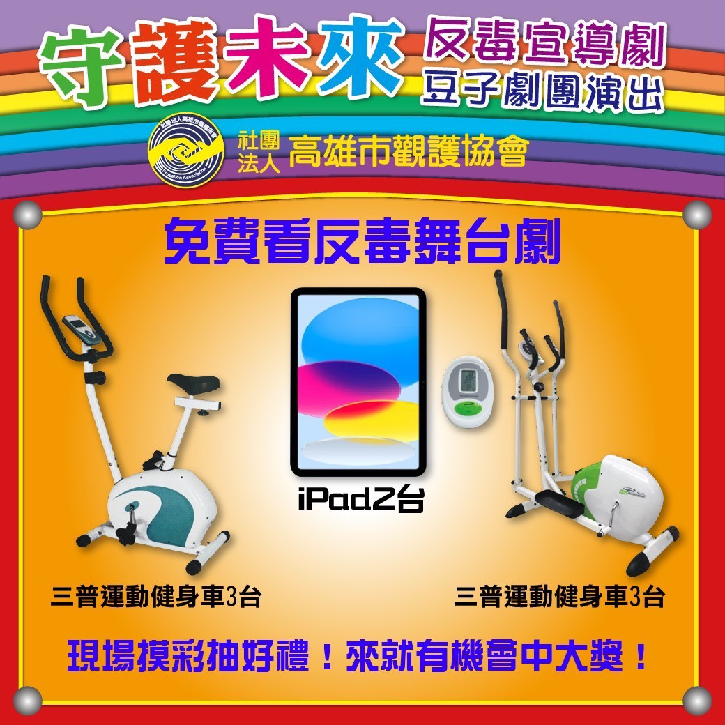 為了鼓勵家庭踴躍參與,本次活動不僅免門票,主辦單位高雄市觀護協會郭家妃理事長及顧問賀令佩女士更自掏腰包,加碼贊助超豐富的摸彩大獎!只要當天來到現場看戲,就有機會參加抽獎。獎品包含 2台 iPad 以及 6台三普運動健身車,現場還有精彩的有獎徵答互動,備有豐富的大小禮物,絕對讓孩子們玩得開心,家長們也有機會把大獎抱回家!