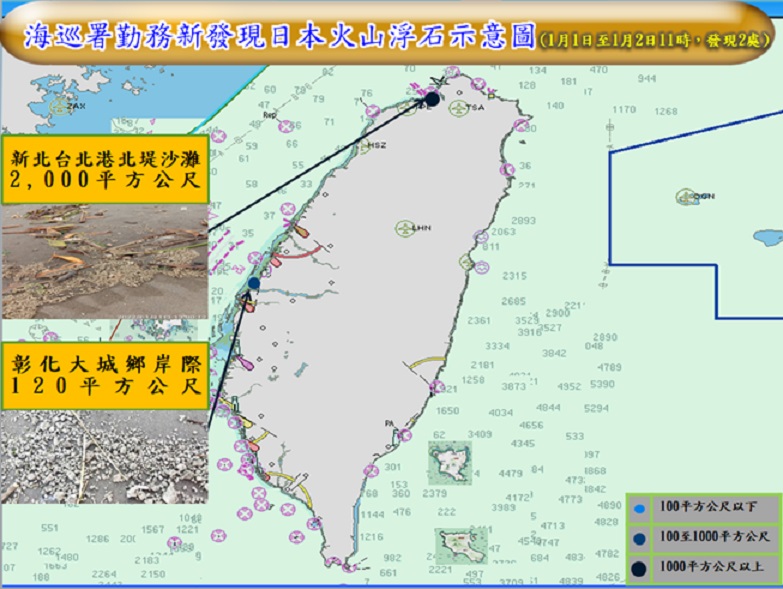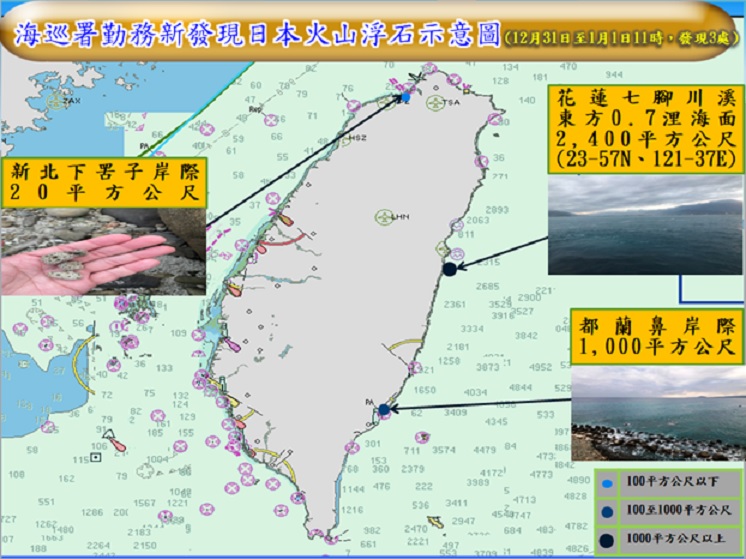 去年12月31日11時至今(111)年1月1日11時止,新發現火山浮石已隨著洋流漂流到台東都蘭鼻岸際(約1,000平方公尺)、新北下罟子岸際(約20平方公尺)、花蓮七腳川溪外0.7浬海面(23-57N、121-37E,約2,400平方公尺)等處,海洋委員會提醒相關區域作業船隻,特別注意航行安全。