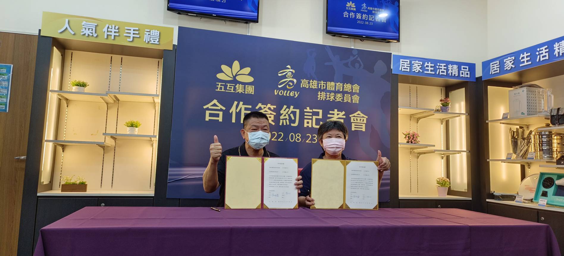 高雄市體育總會排球委員會與在地優質企業「五互集團」結合,提升高雄市排球風氣23日在龍海線上GO服務展示中心合作簽約,排球委員會郭明霖主任委員與五互集團陳秋白總裁簽署合作意向書,希望透過企業資源支持,帶動高雄市排球運動發展,培育更多優秀排球運動員。
