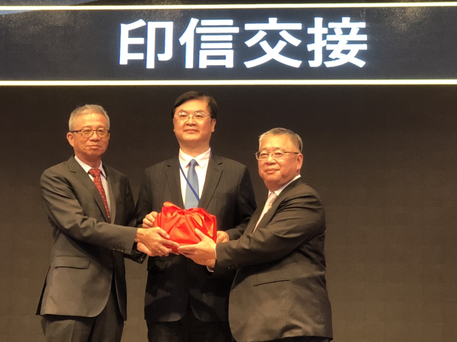 大發工業區廠商協進會改選弘偉環保劉正光〔右〕接下林宗正棒子