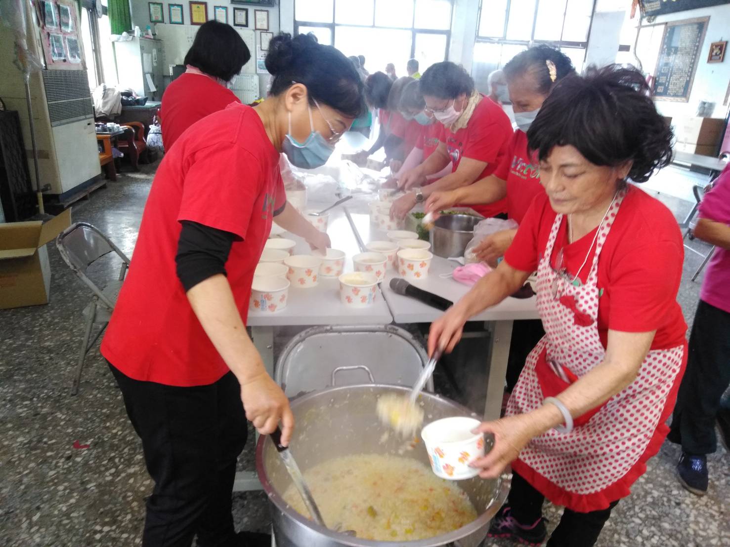 大寮里、大寮里社區發展協會歲末年初辦愛心送溫暖發放臘八粥和集發票送春聯活動,退休教師洪芳美率志工們準備1500份臘八粥發放給社區弱勢、長者場面溫馨。