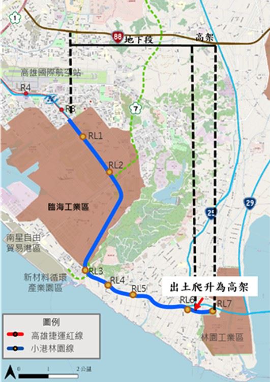 小港林園線總長約11.59公里,路線起於高雄捷運紅線R3車站所預留之隧道,續採地下隧道往南延伸,經沿海二路、沿海三路、中門路、沿海路四段~沿海路二段,於林園11號公園後爬升,於中芸排水前出土爬升為高架,止於高值化產業園區前,設置7座車站,分別為地下車站6站、高架車站1站,可服務南高雄地區,串連南北產業園區與高雄國際機場,帶動各區均衡發展,每年可服務上百萬觀光遊憩旅次;透過串聯台積電等南部半導體S廊帶,啟動石化產業轉型升級,邁向高值化發展契機;另外鼓勵汽機車使用大眾運輸,降低客貨混流的行車風險,每年平均亦可減少傷亡近百人,捷運小港林園線推動有其必要性。