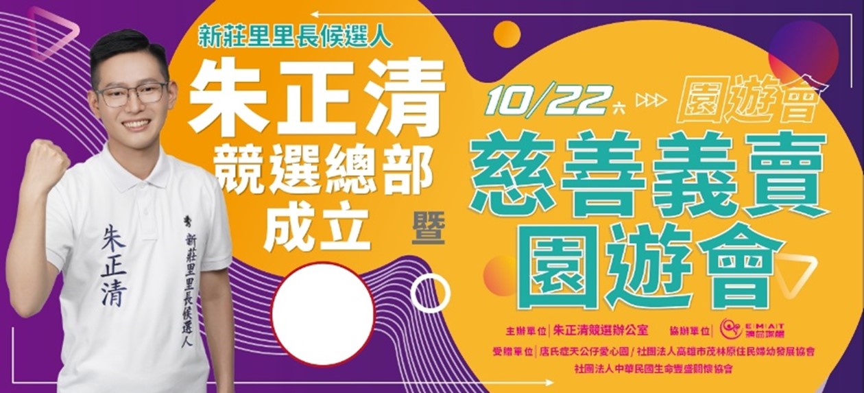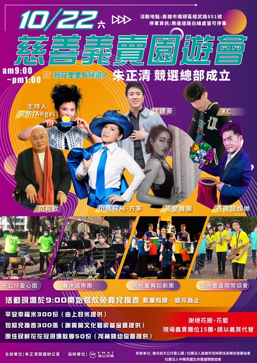 橋頭區第一大里新莊里里長選舉,候選人朱正清比選市議員還慎重,辦慈善園遊會,知名藝人小鳳飛飛-方寧,發片歌手沈建豪,網紅熱搜KC等,現場還有數十個好吃好玩的攤位,朱正清競選辦公室歡迎民眾闔家蒞臨。