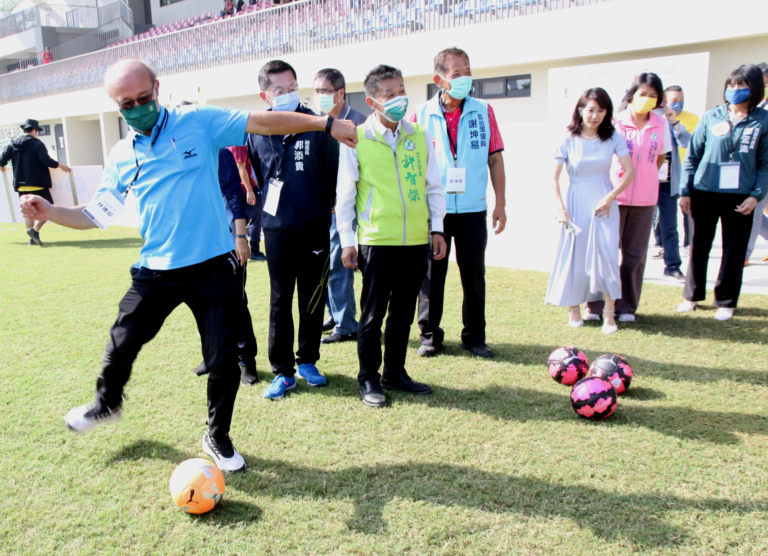 教育部林騰蛟次長、秘書長郭添貴、劉世芳立委、許智傑立委、柏文健康事業公司陳尚義董事長與多位民意代表共同為楠梓足球場開幕。教育部林騰蛟次長表示楠梓足球場係配合行政院前瞻計畫,教育部體育署支持與經費補助2.4億,市府自籌1.1億,耗時兩年時間打造為南台灣足球基地,並符合國內足球競賽場地設施標準,成為高雄市首座足球運動發展中心。該場地預期可成為各球隊、民間團體、企業與職業球賽場地,期許此場地可開設足球課程,並在學校、社區積極推動足球運動。