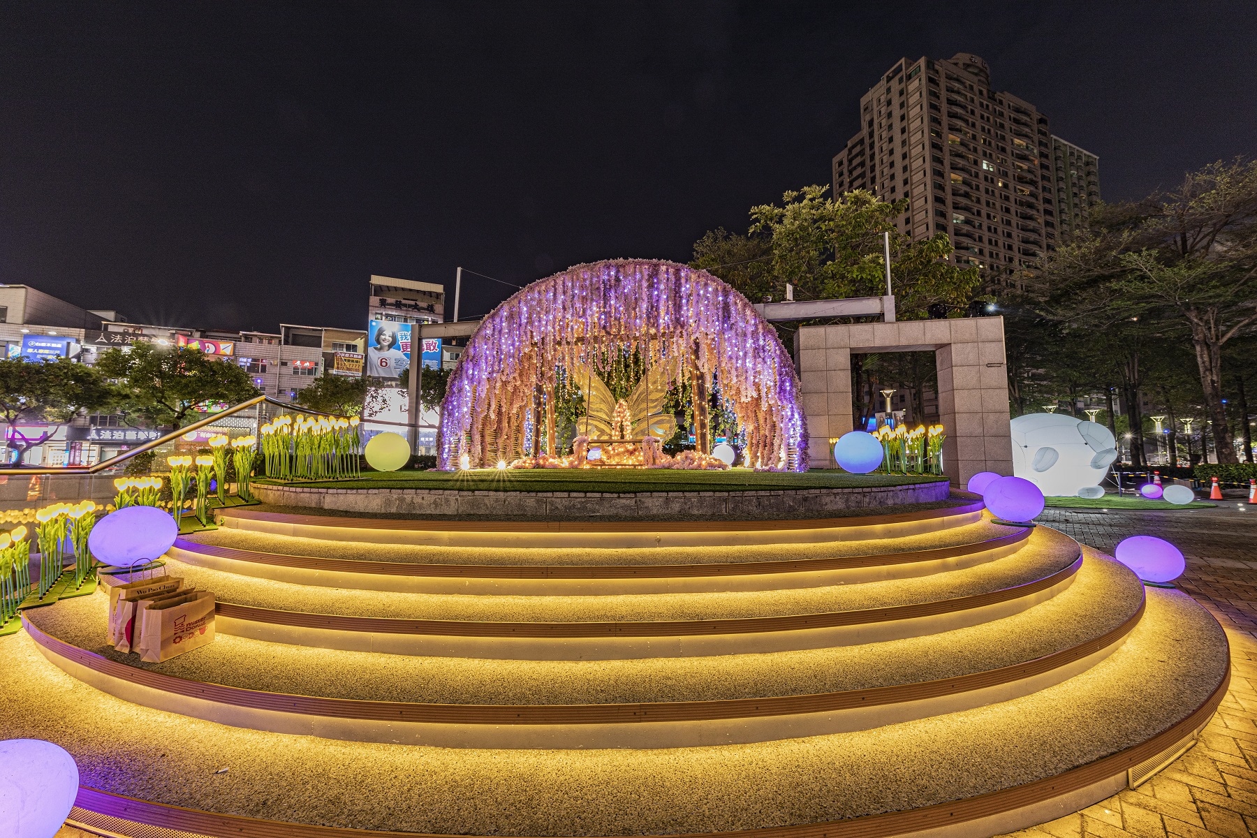 2023年即將迎來兔年登場,更是於噴水池上方特別設置「幸福兔寶包」燈區,雪白的可愛兔子慵懶玩耍,超萌動作瞬間融化民眾的心,圓滾滾的呆萌模樣更是另一大亮點,全新打卡點絕對不能錯過!
