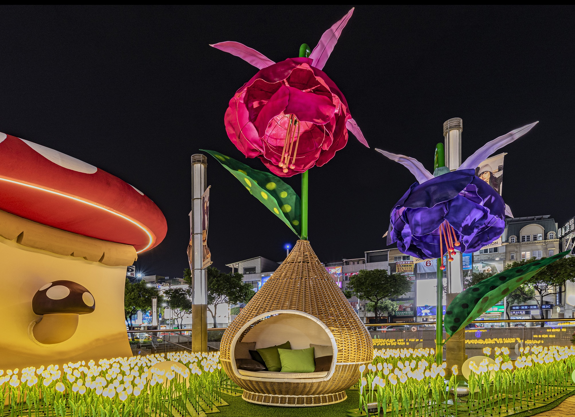 每年南部最期待的佈置就屬漢神巨蛋,今年以童話世界 Fairy Tale為主題,打造出冬季最浪漫的聖誕景緻,小精靈及精緻閃亮的花朵佈滿聖誕樹,樹頂更有一隻展翅蝴蝶,搭配光影翩翩起舞,將高雄的夜晚點綴得繽紛浪漫。花海間「花仙子的發呆椅」搭配花朵燈海拍照彷彿縮小成精靈隱身其中,穿越到一個無憂無慮、沒有季節更迭、充滿想像的童話世界。一路延伸至「花瀑鞦韆」與好友一起沉浸在花花世界中,除了浪漫花海外更有「白雪公主的蘑菇小屋」、「愛麗絲奇幻扭扭屋」,體驗童話故事中的場景氛圍,沉浸在愛與分享的美麗幻境,奇幻又不失品味,白天夜晚都有不同的氣氛。