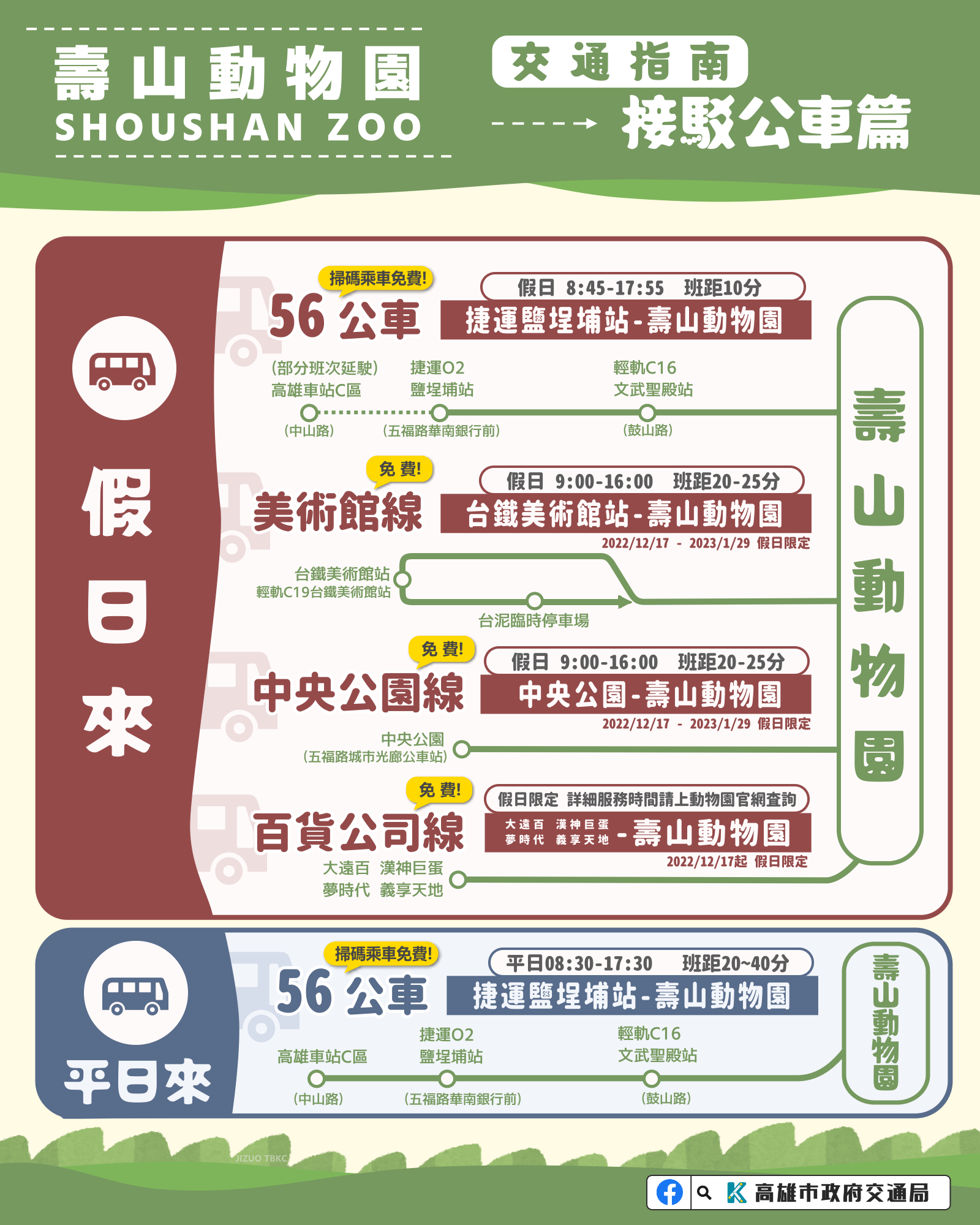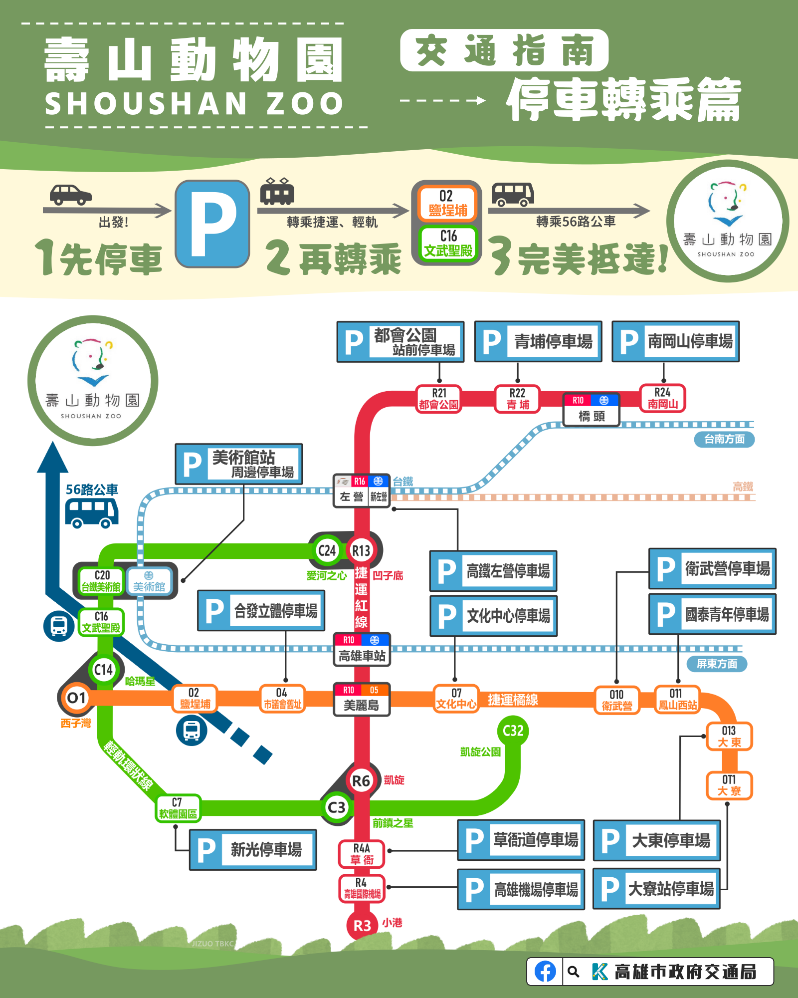 交通局呼籲遊客可多利用大眾運輸前往動物園,遊客可先將車輛停放至捷運、輕軌周邊停車場停放車輛,再轉乘捷運至橘線鹽埕埔站(O2,1號出口)、輕軌文武聖殿站(C16)下車,轉搭「56號公車」至動物園,56路公車例假日加密班距至每10分鐘一班車。