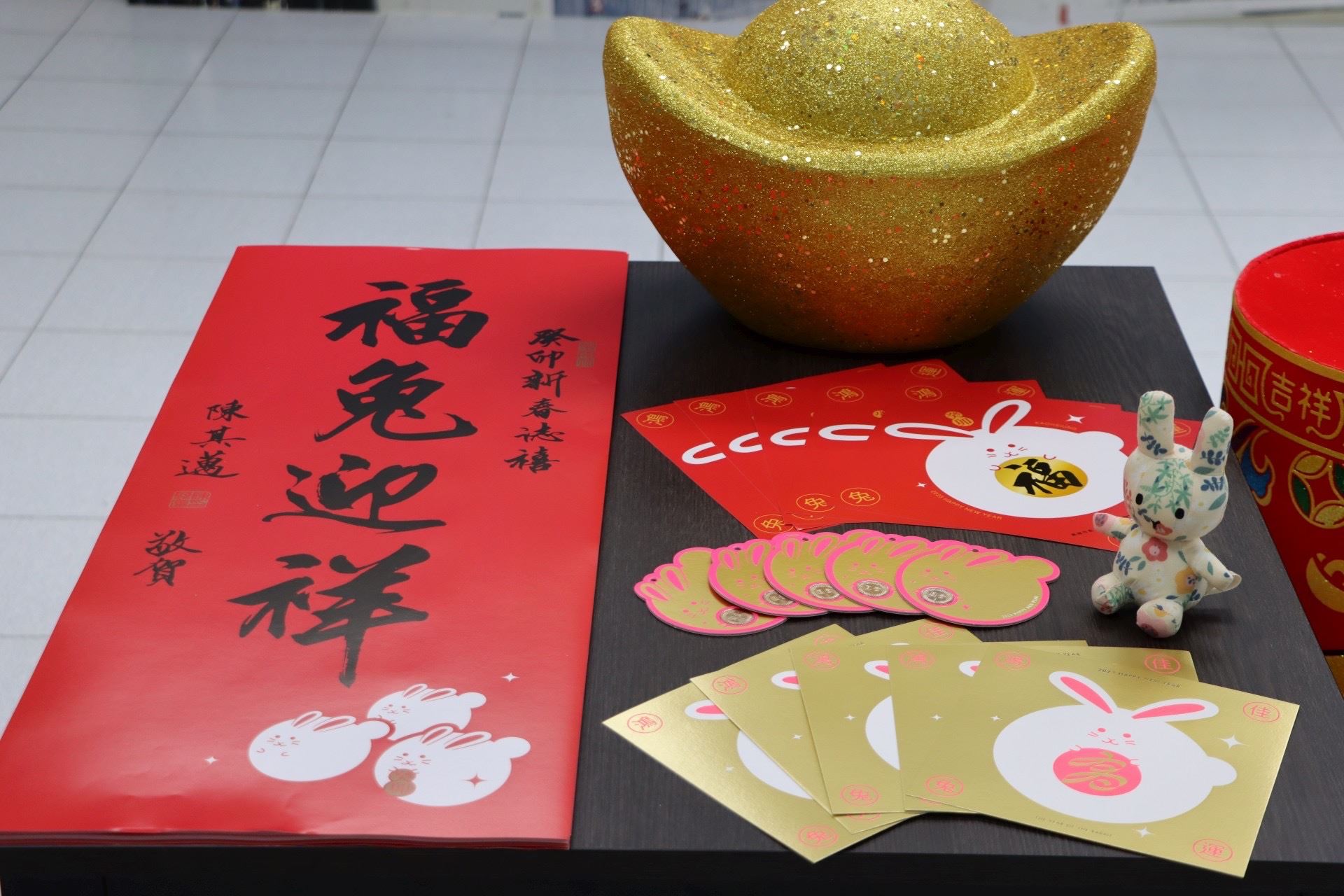 《鴻運佳兔》斗方春聯、兔年開運小紅包及賀卡,由出生高雄林園(現年31歲)新銳設計師林士揚創作。林士揚曾獲德國紅點傳達設計獎、墨西哥海報雙年展、芬蘭拉赫第國際海報三年展、台灣國際平面設計獎、俄羅斯金蜂獎、台灣海報新星獎等多國獎項,是年輕一代極具潛力的設計藝術家;本次以幾何簡約造型的癸卯兔象徵高雄的現代與活力意象,利用桃紅代表除舊佈新,並運用大大小小的圓形所構成的賀卡、斗方春聯及開運小紅包設計,蘊含一切順利圓滿、財源滾滾的祝福寓意。