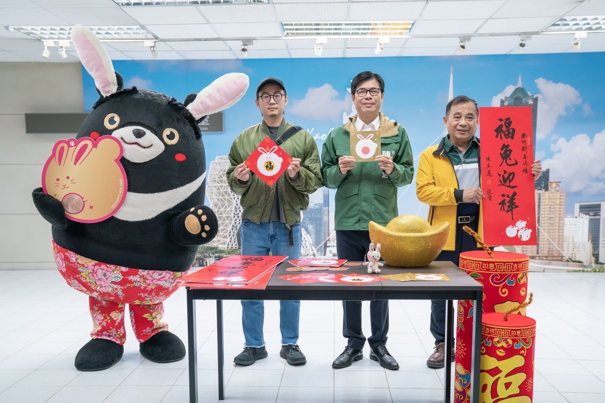 農曆春節即將到來,高雄市長陳其邁今(6)日攜手觀光大使「高雄熊」向市民拜早年,並搶先曝光市府特別製作的多款2023兔年限定高雄版新春小物。包括《福兔迎祥》春聯、《鴻運佳兔》斗方春聯及兔年開運小紅包、賀卡等,祝福市民朋友,兔年好運擋不住、兔年財運滾滾來。