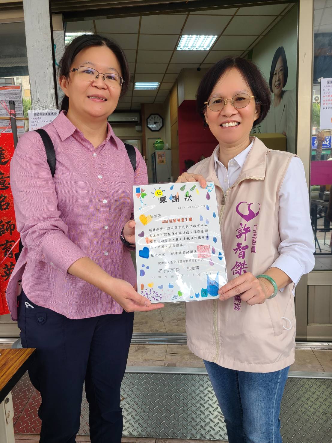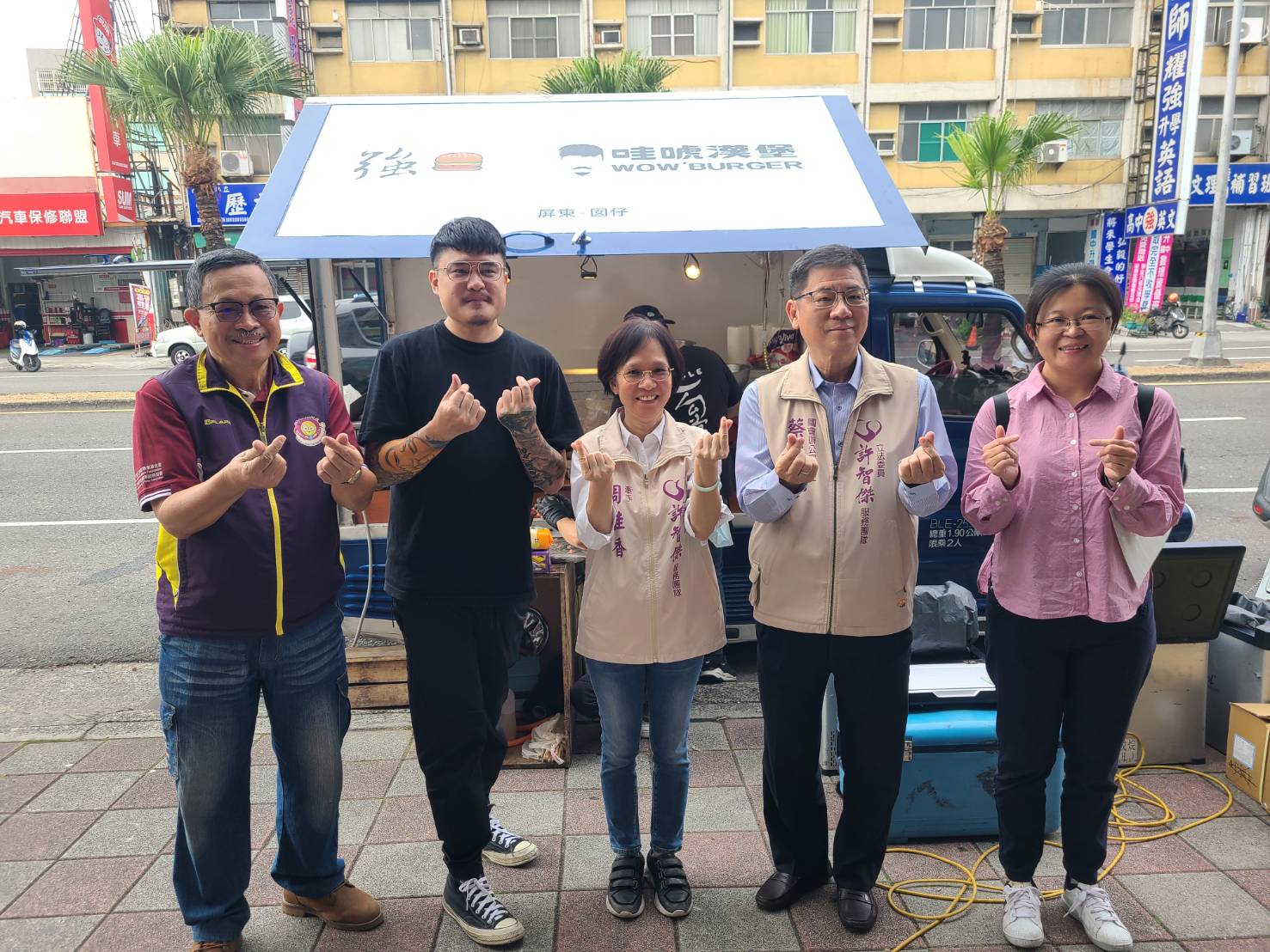 立法委員許智傑響應阿強老闆的善心之舉,聽到漢堡胖卡即將來到鳳山五甲,第一時間隨即提供服務處場地提供使用,並由委員夫人代表,與阿強老闆捐贈超大漢堡給「社團法人高雄市腦性麻痺服務協會」與「財團法人聖功社會福利慈善基金會」一起享用,將愛心傳遞出去!