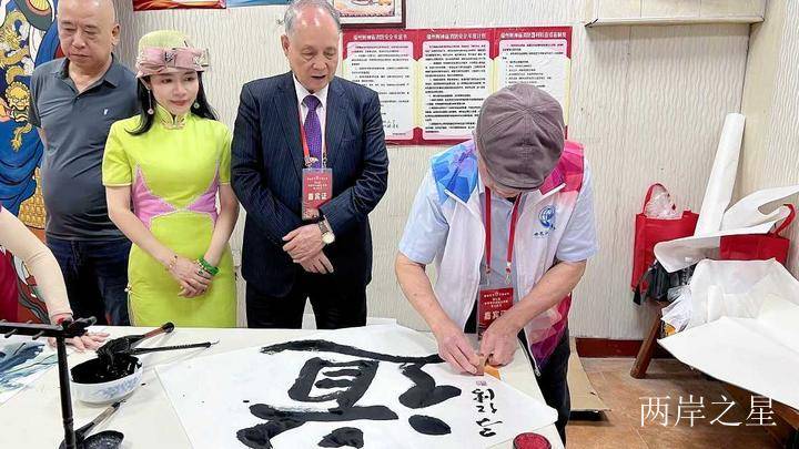 下午,林中森受福建省道教協會副會長、福州財神廟住持王寧邀請,到福州財神廟進行兩岸筆會交流,欣賞李德珍、田玉生、呂仁清三位大師現場揮毫。王副會長與余理事長特別共同贈送給林中森,「兩岸一家親•共圓中國夢」錦旗,感謝林理事長對兩岸交流活動的大力支持。余理事長則致贈錦旗給王副會長及台北玉樞院宮副理事長游凱傑,感謝他們攜手友誼,助力兩岸交流。