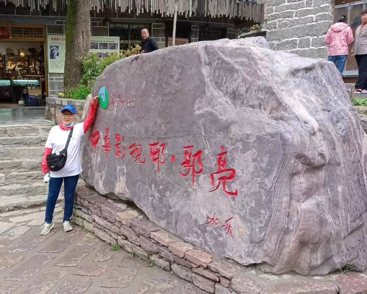 客在「中華電影邨˙郭亮」巨石前,留影作紀念。