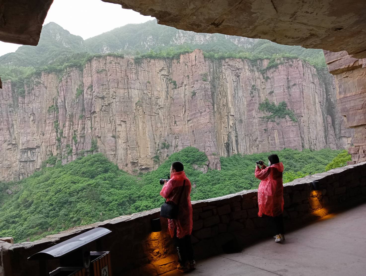 郭亮掛壁公路其峭壁上,鑿有間歇的側開窗,據導遊介紹,是過去開路時,村民冒生命危險,從對邊用繩索盪過來,從開窗處開鑿,旁邊便是峭壁峽谷,透過窗口看下