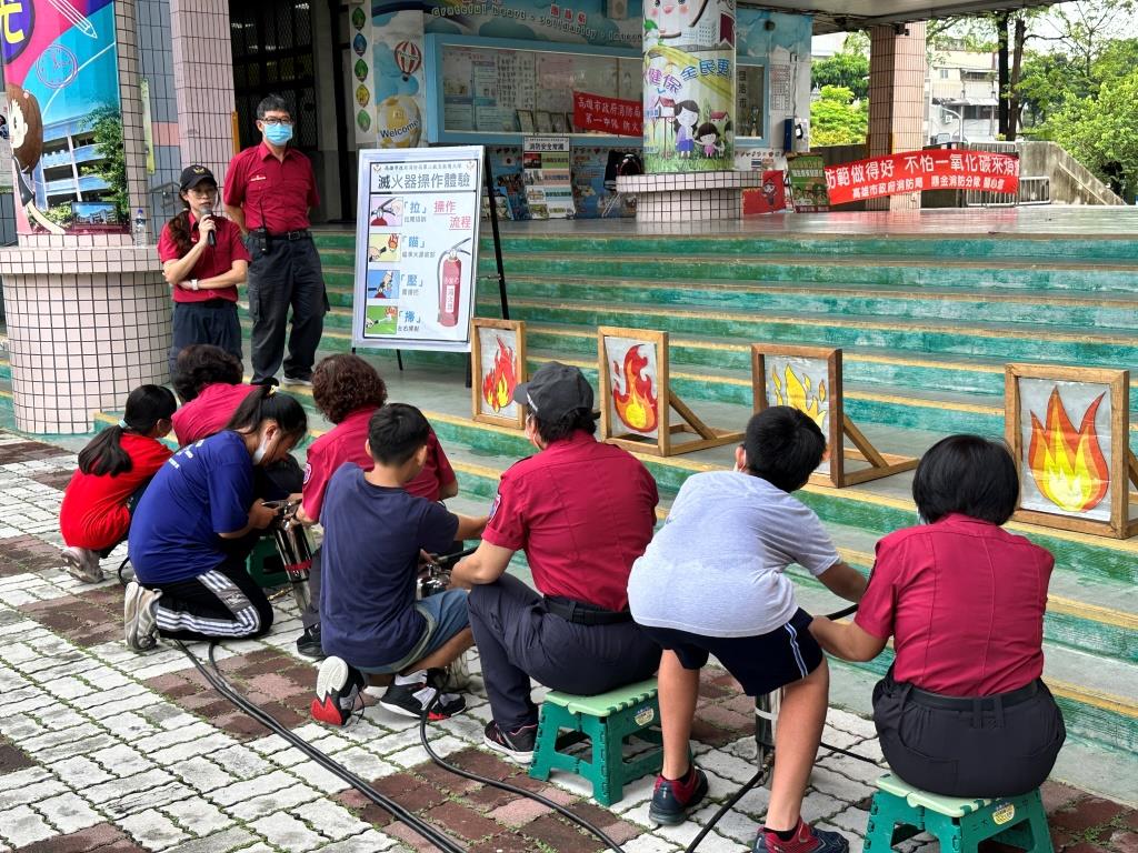 最後,因應目前水源短缺的狀況,學童操作水滅火器,僅打出空氣不射水,同樣可以透過水滅火器的實際操作,拉(插梢)、瞄(火源)、壓(把柄)、掃(向火源根部左右噴灑)的口訣,好記又實作,讓學童從小扎根防災意識,將正確的操作要領牢記心,就能「金安心」。