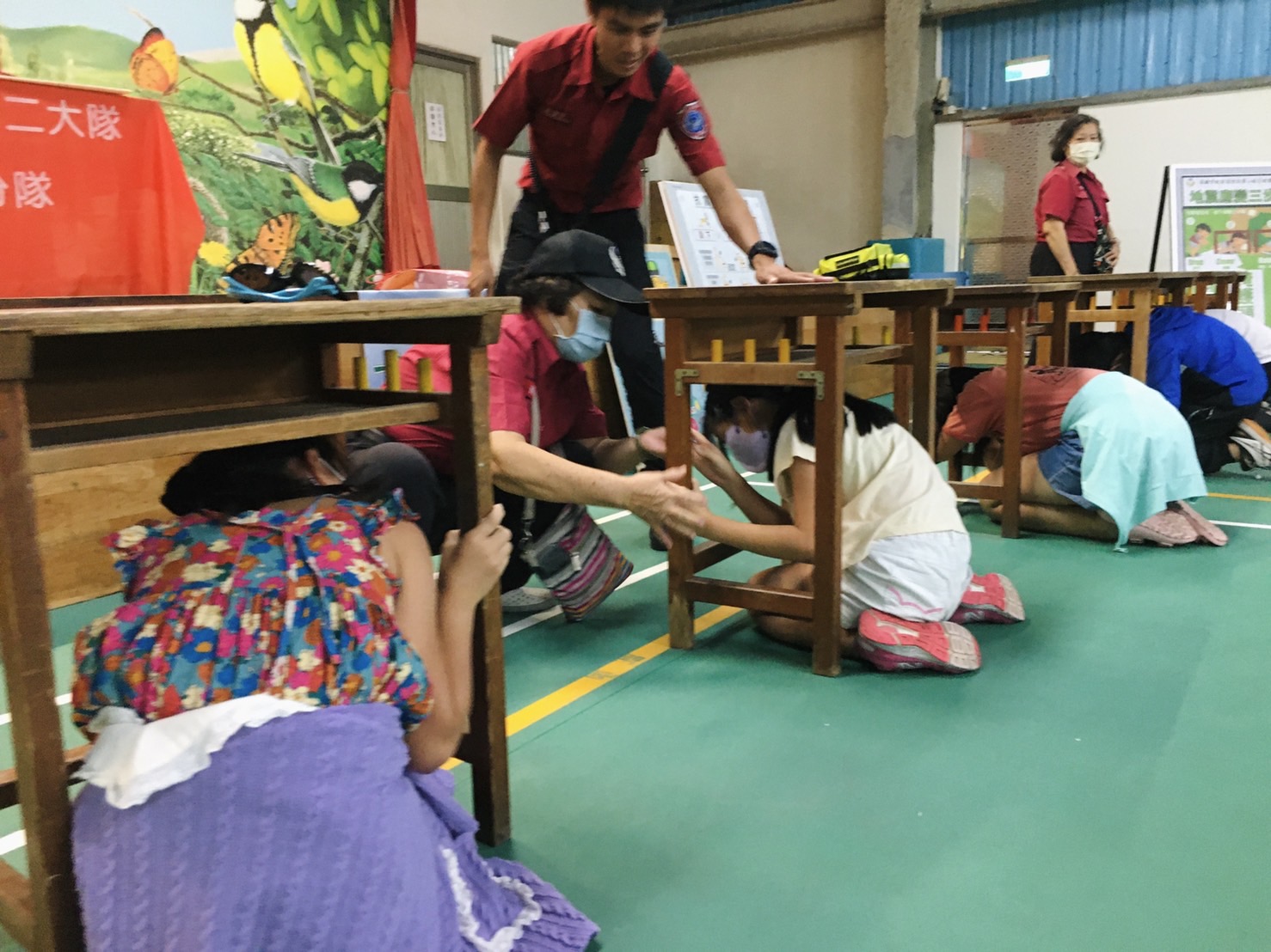 另外,模擬火場煙霧的環境,讓學童熟知在視線不明且充滿濃煙的正確火場逃生姿勢,地震來臨時需要做的正確保命動作。