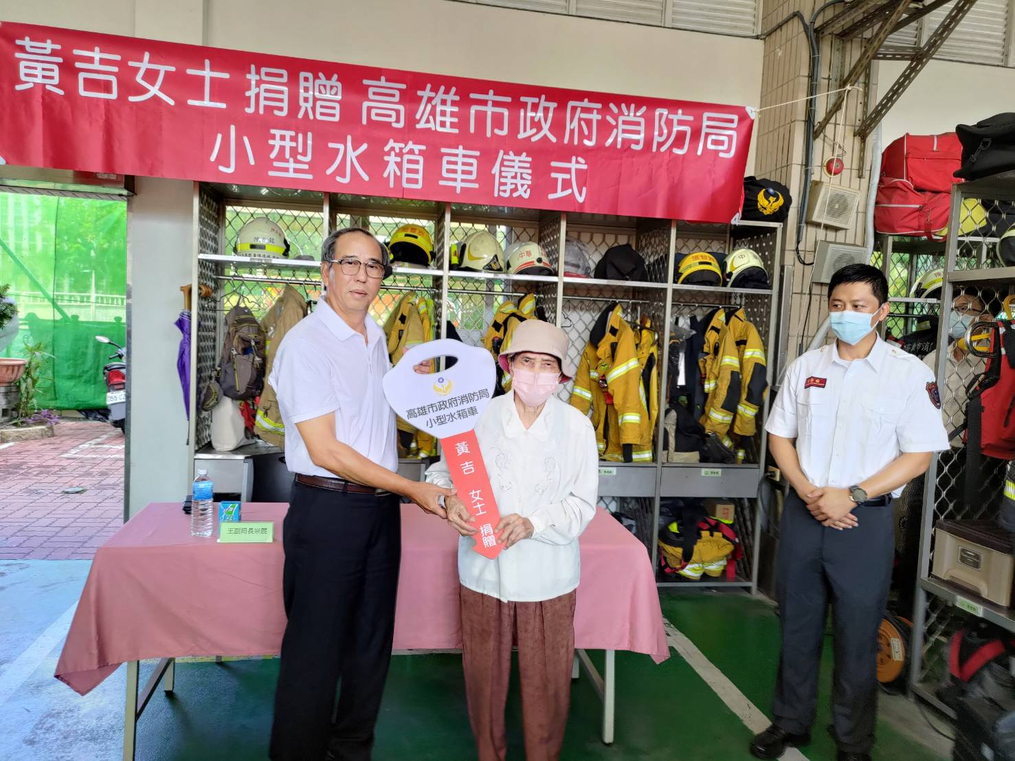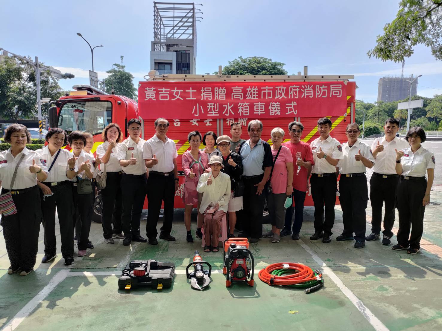 7月14日黃吉女士家屬捐贈高雄市政府消防局第二大隊中華分隊消防小型水箱車1輛及救災裝備1批,由高雄市消防局副局長王宗展接受捐贈,並頒發消防車紀念品與感謝狀,感謝黃吉女士的善行義舉。