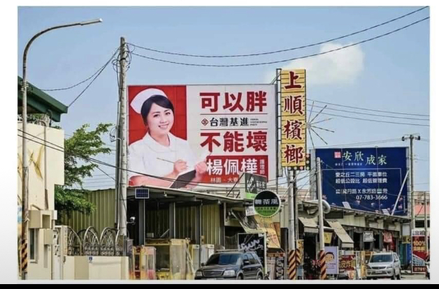 曾喊出「要下架邱于軒」的台灣基進林園、大寮區市議員參選人楊佩樺,近期在選區掛上看板,她穿著護士服,一旁搭配一句大大的「可以胖不能壞」,雖然沒有直接點出針對誰,但已經引起一陣議論。