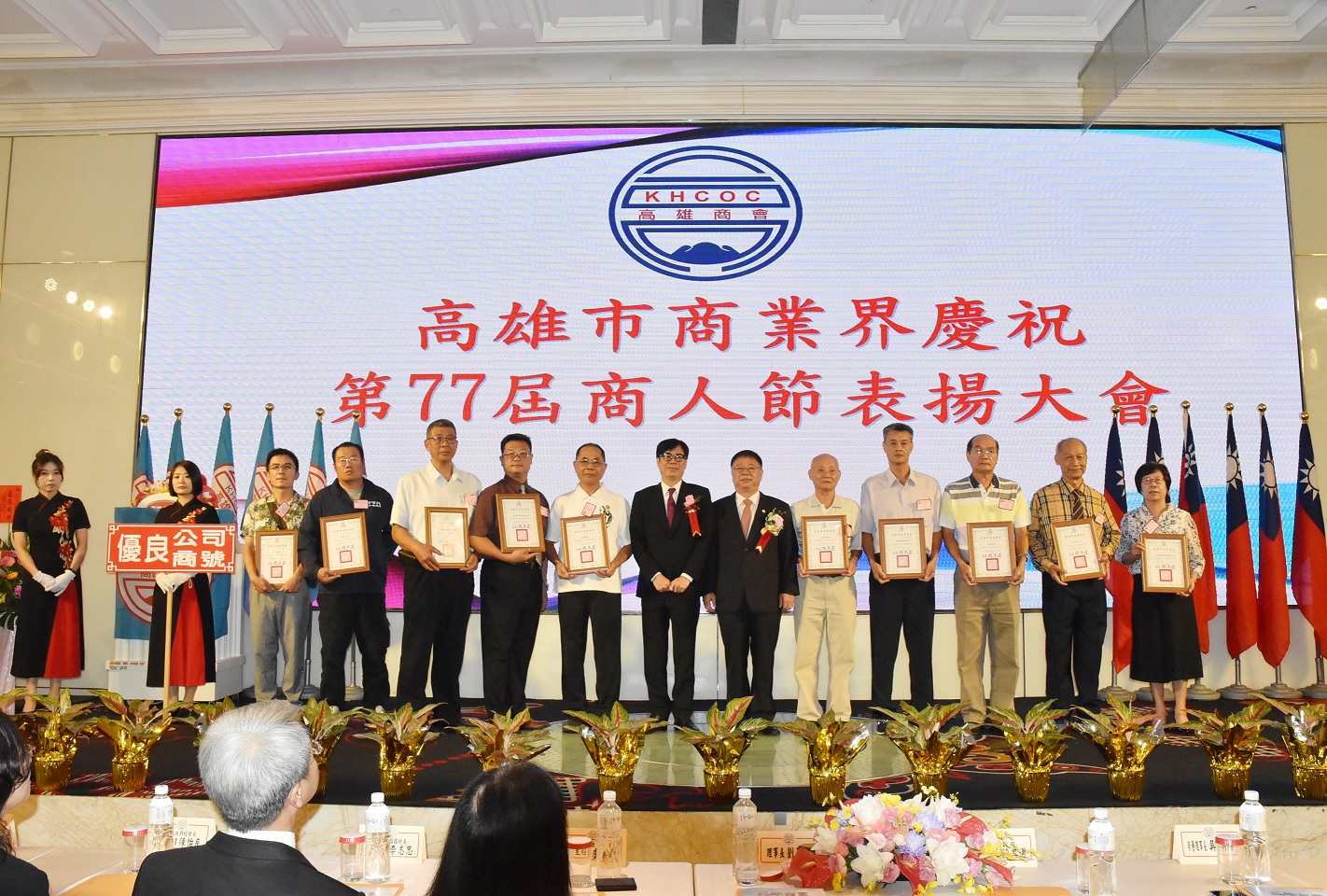 高雄市商業界慶祝第77屆商人節暨表揚大會,1日在林皇宮三樓樂喜廳熱鬧登場,由高雄市新商業會理事長劉正光主持,市長陳其邁到場致意,現場冠蓋雲集,喜氣洋洋。行禮如儀後,大夥移至五樓全環球廳餐敍。