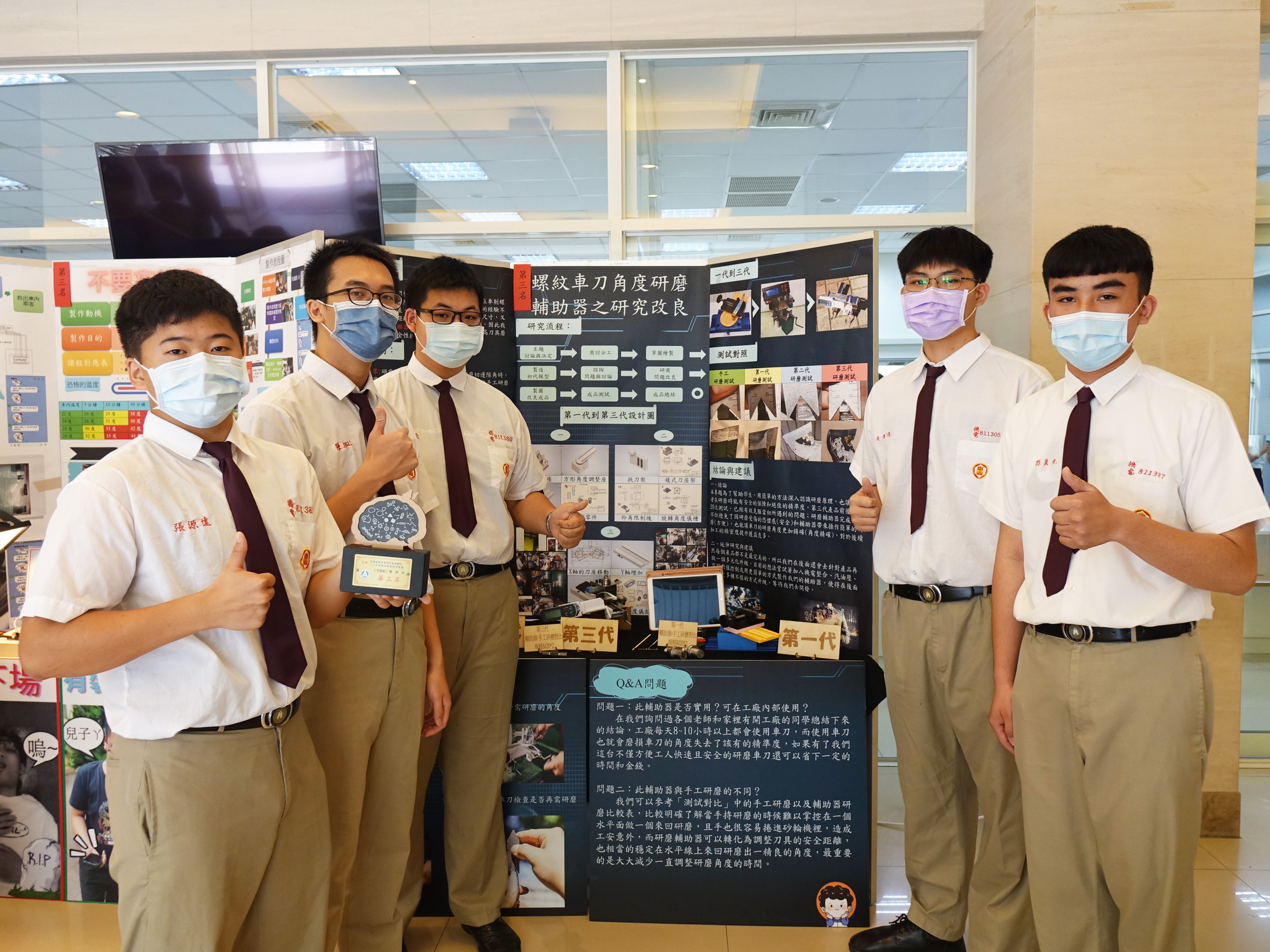 機械群專題組機電科孫晟元、吳佳俊、張源達、吳秉澤、陳泓睿等五位學生在李登原、蘇玲于老師指導下,以「螺紋車刀角度研磨輔助器之研究改良」摘第三名。