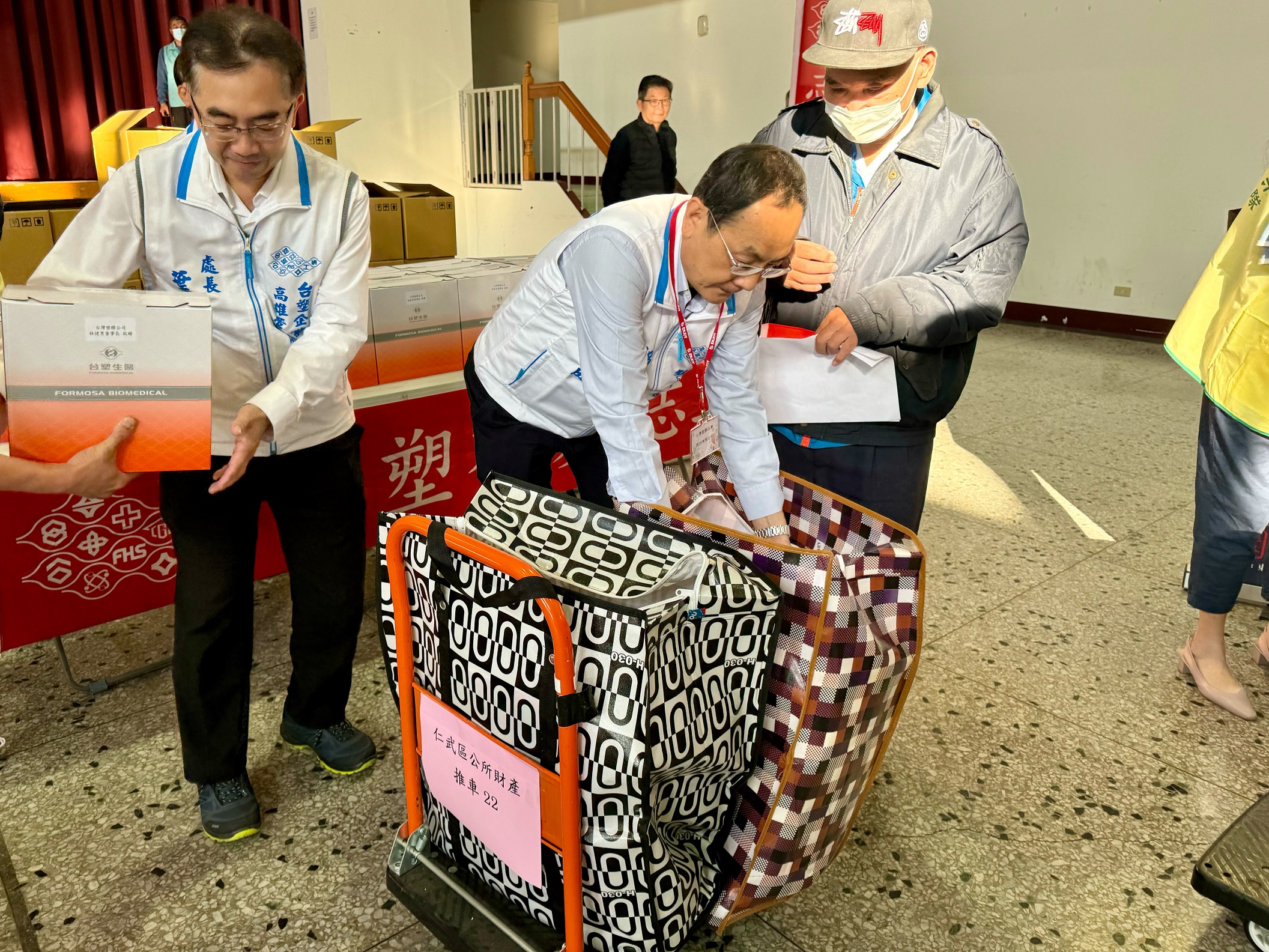 寒冬送暖活動27日上午八時在仁武里民活動中心登場,台塑企業等單位在現場擺攤發放紅包禮金及愛心物資,區公所貼心準備250個大型環保提袋和30部推車,協助低收入戶及邊緣戶領取愛心物資。