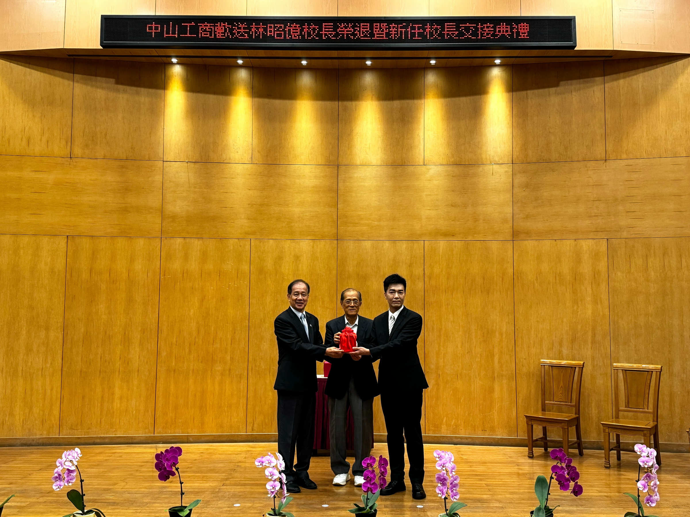 〔本報記者陳明成高雄報導〕中山工商六日新卸任校長交接,由陳國清董事長監交下,榮退的林昭億將印信交給新任的李昱平校長。中山工商改制後50年來唯三校長同台,場面莊嚴又罕見。