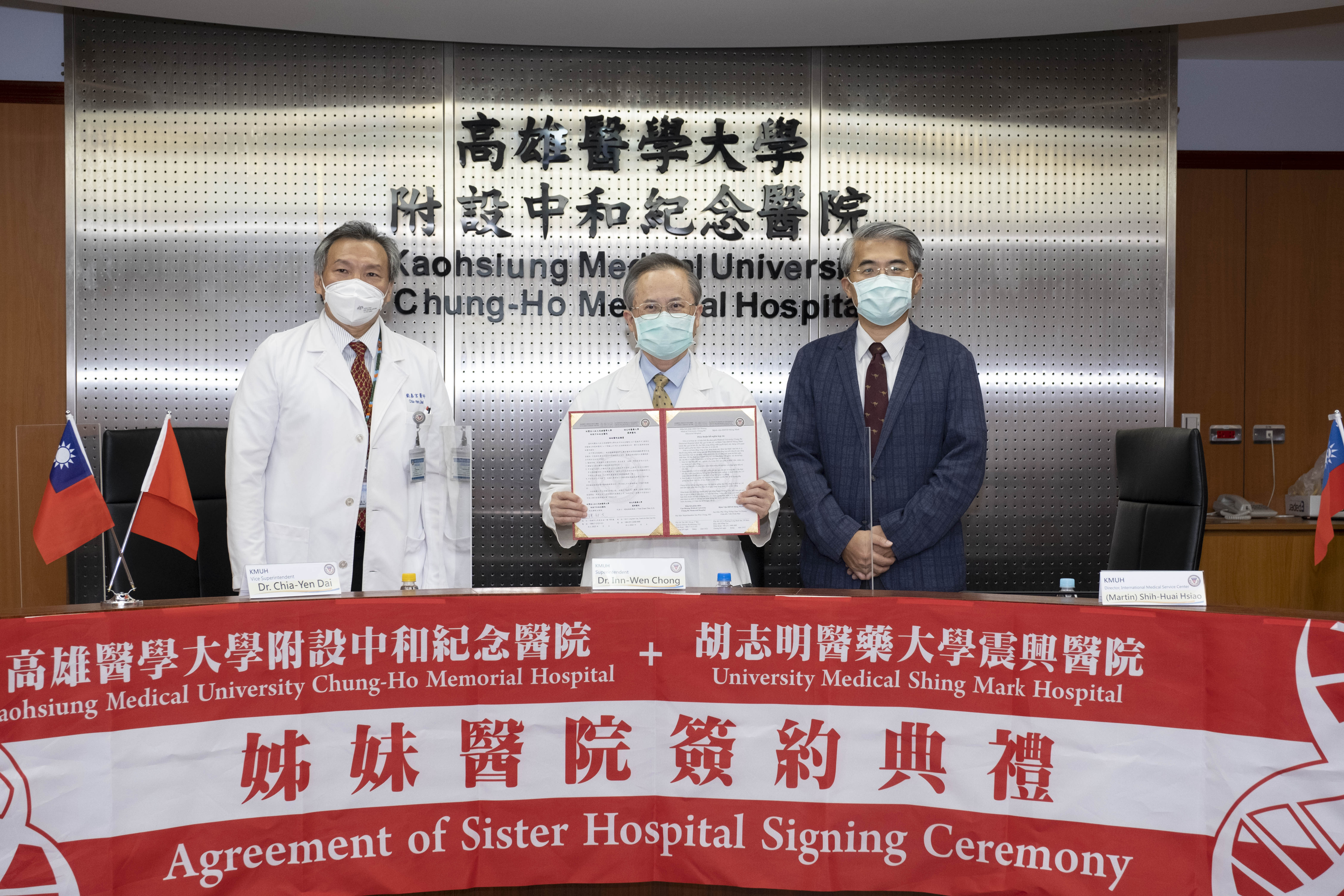 高醫與越南震興醫院締結姊妹醫院高醫院長鍾飲文(中)、副院長戴嘉言(左)及國際醫療中心主任蕭世槐代表出席。