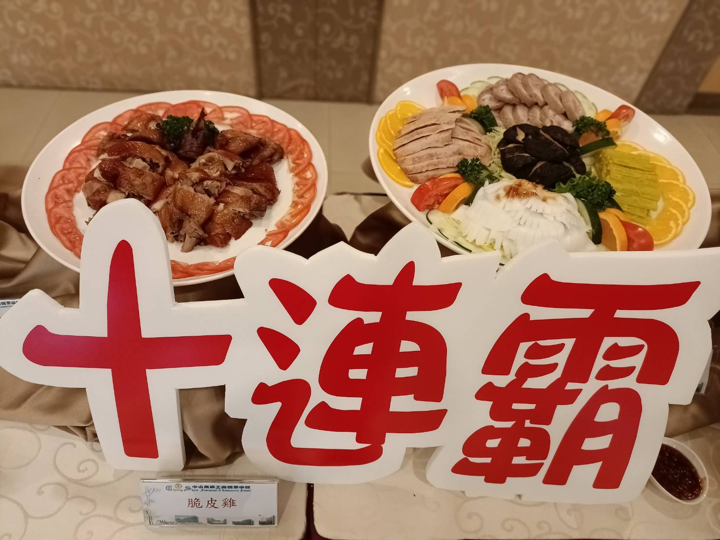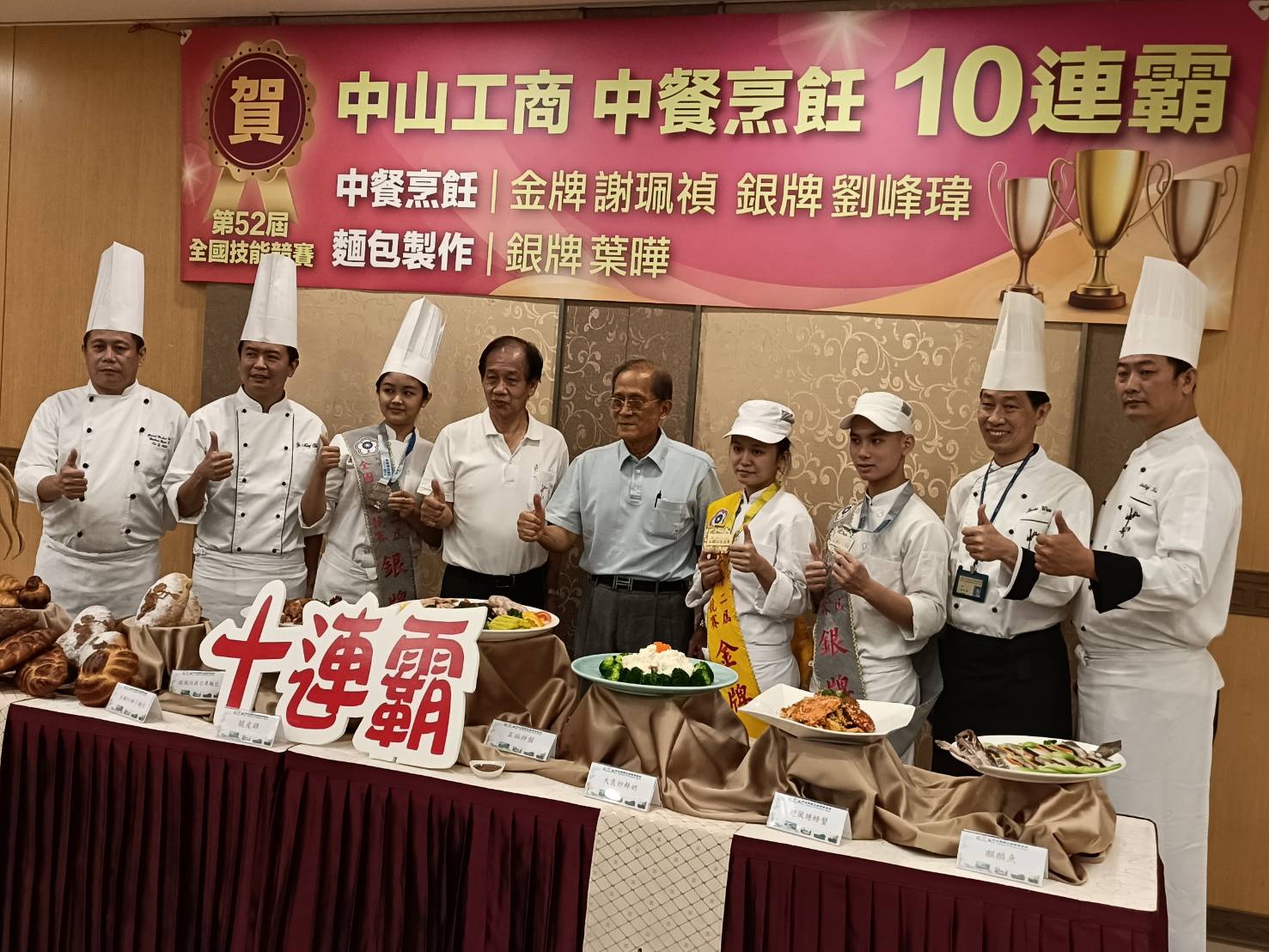 中山工商真的締造「十全十美」不可能的紀錄!中山工商餐飲科二年級生謝珮禎與劉峰瑋聯手摘下第52屆全國技能競賽中餐烹飪金、銀牌,完成十連霸。麵包製作由葉曄奪銀,錦上添花。